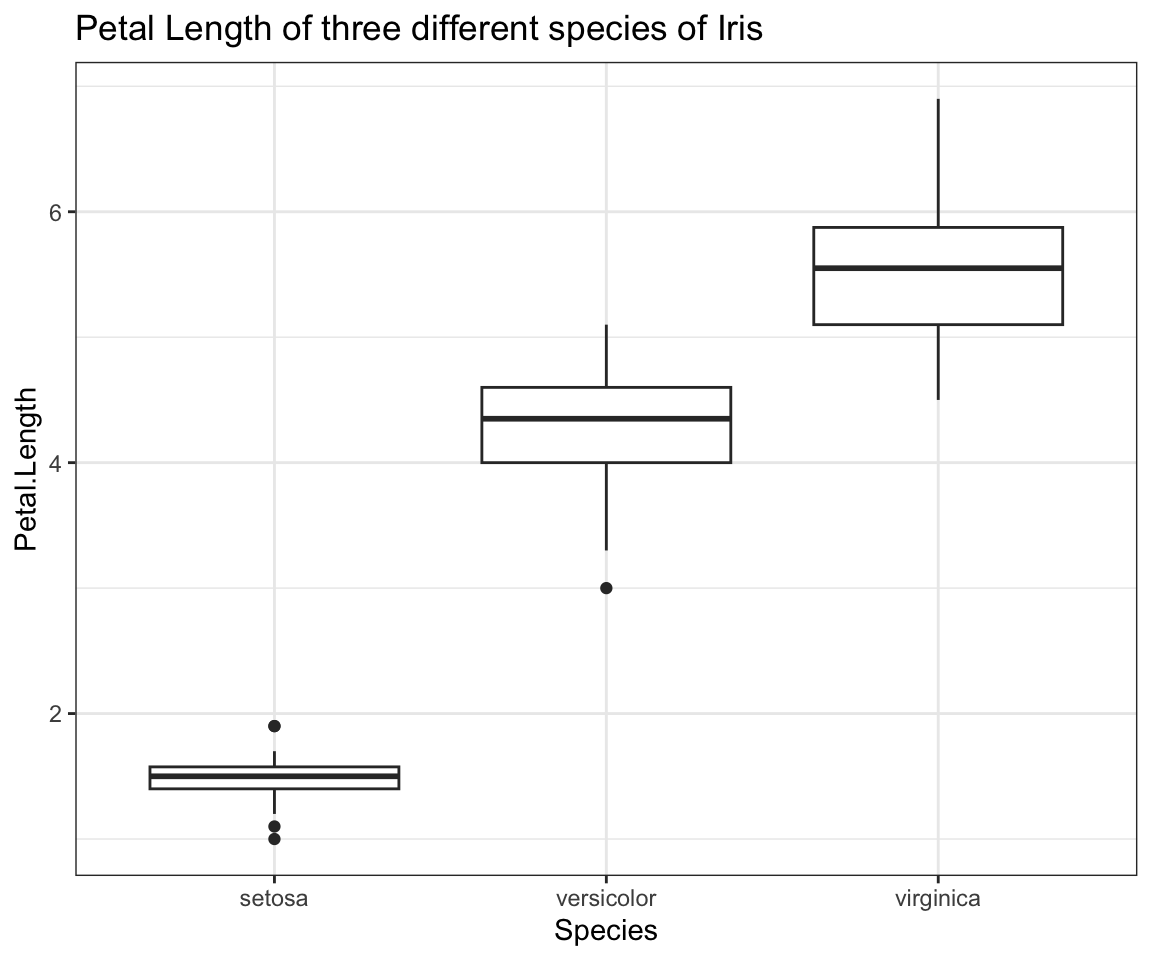 THis boxplot shows us exactly how the distributions of petal length measurements of our three species of Iris are differing from one another. Despite the obvious trend in the data, be sure not to report results through figures alone! We will find out how to test whether the pattern we can observe here holds up to scrutiny at a later point in time of our seminars.