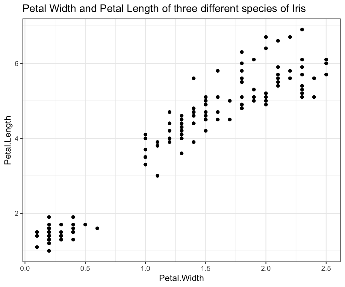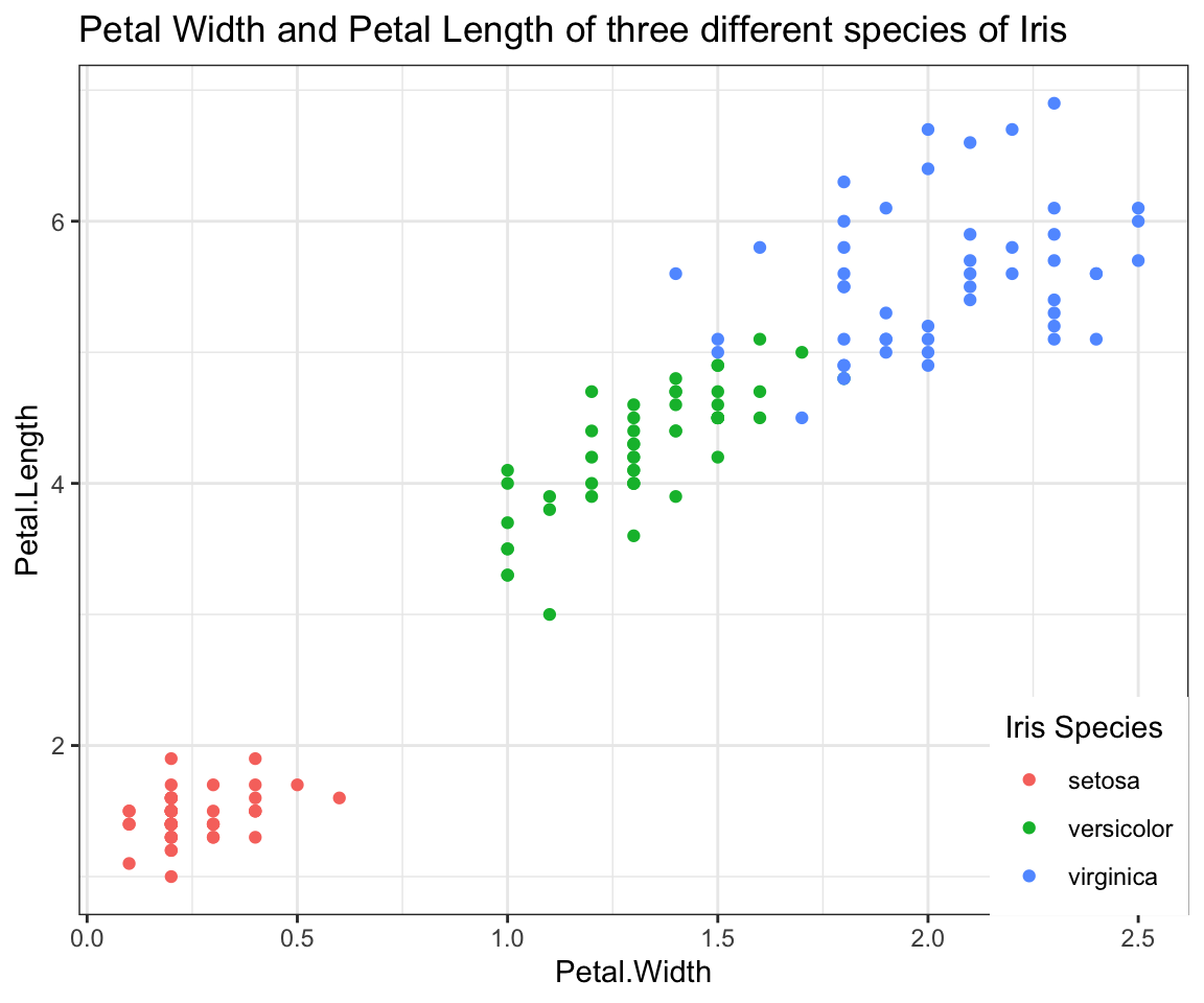 theme_bw() + labs(title="Petal Width and Petal Length of three different species of Iris") +