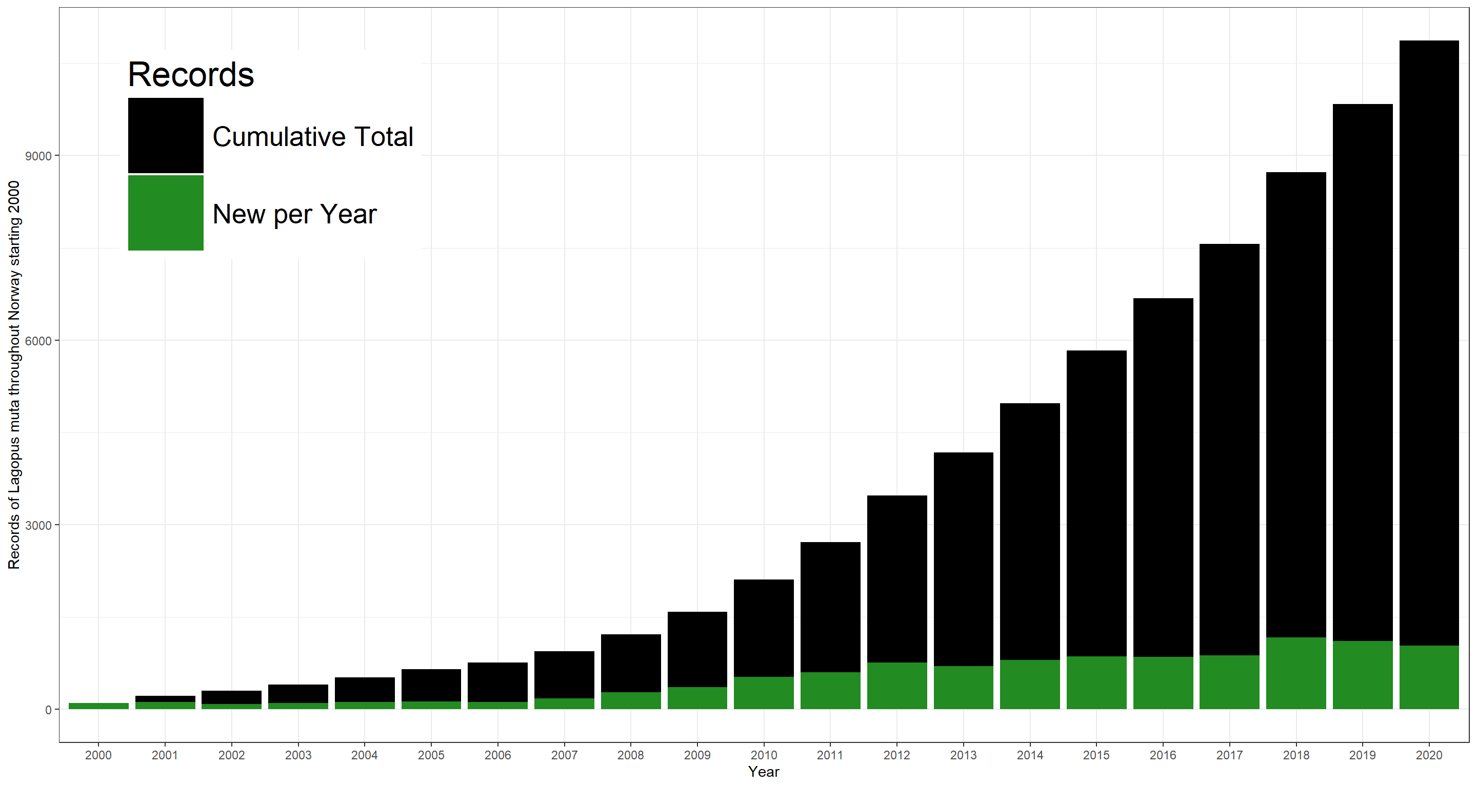 Using both of these, we obtain the same output of $1.07599\times 10^{5}$ Lagopus muta records mediated by GBIF. Note that this number will likely be higher for you as data is continually added to the GBIF indexing and this document here is frozen in time (it was last updated on 2024-11-15).