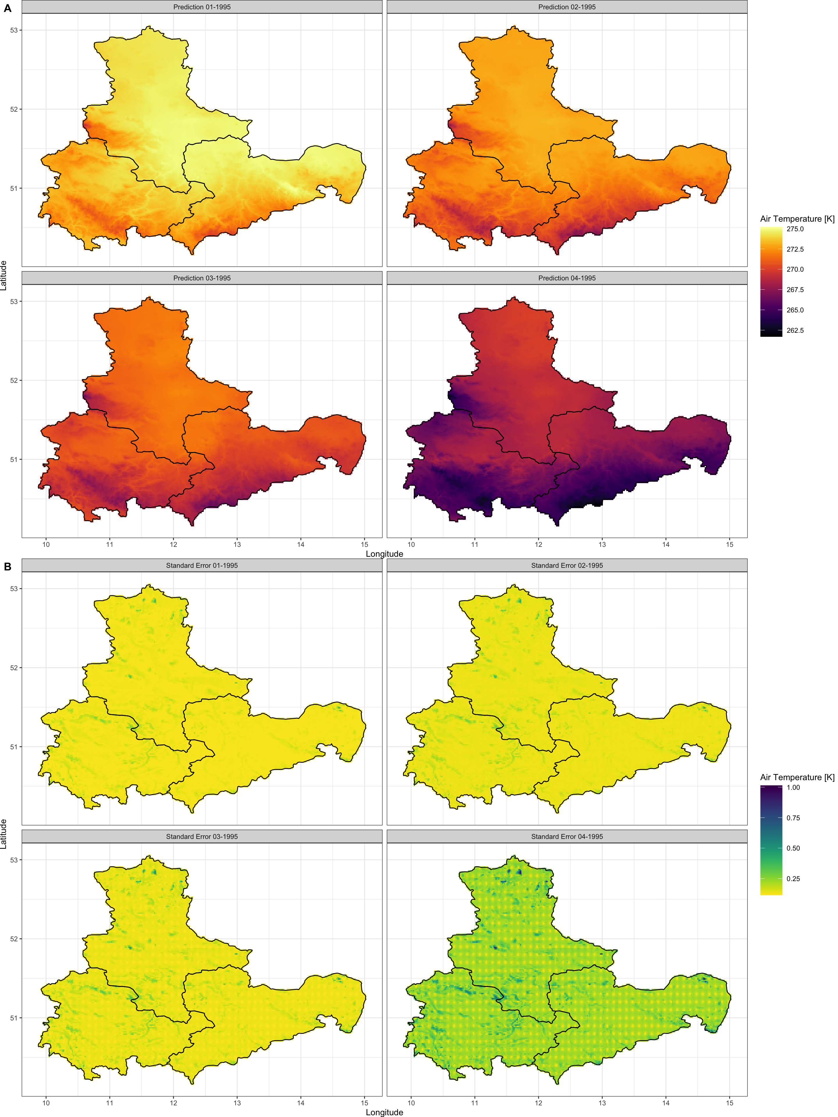 As you can see, the elevation patterns show up clearly in our kriged air temperature output. Furthermore, you can see that our certainty of Kriging predictions drops on the 04/01/1995 in comparison to the preceding days. However, do keep in mind that a maximum standard error of 0.131, 0.143, 0.154, 0.264 (for each layer of our output respectively) on a total range of data of 5.688, 6.684, 6.298, 8.816 (again, for each layer in the output respectively) is evident of a downscaling result we can be confident in. We also demonstrated reliability of kriging in this publication (Figure 3).
