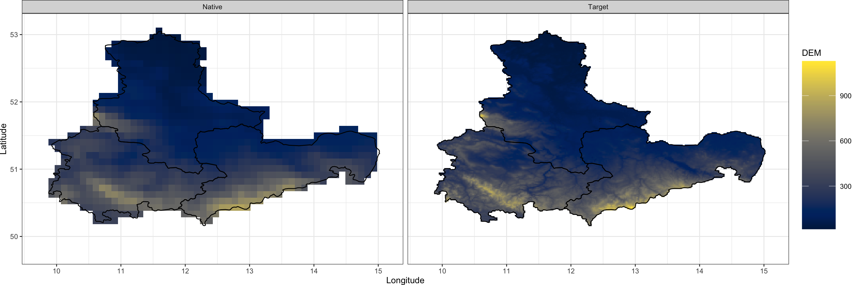You will find that the target resolution covariate data comes at a resolution of 0.017 instead of the 0.02 resolution we specified. This happens because download_DEM() calls upon the raster::aggregate() function when aggregating the high-resolution covariate data to your desired target resolution and is thus only capable of creating target-resolution covariates in multiples of the base resolution of the GMTED 2010 DEM we are using as our default covariate. This happens only when the Target_res argument is specified to be a number.