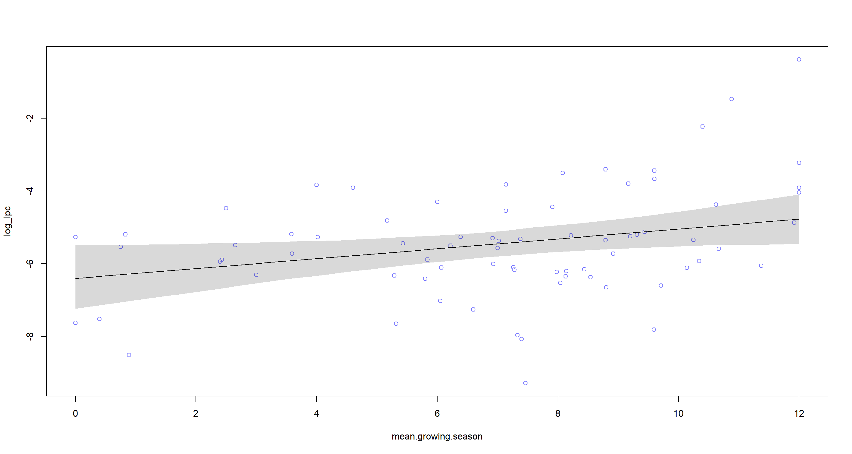 data = dt, col = rangi2, xlim = c(min(d$mean.growing.season), max(d$mean.growing.season)), ylim = c(min(d$log_lpc), max(d$log_lpc)),