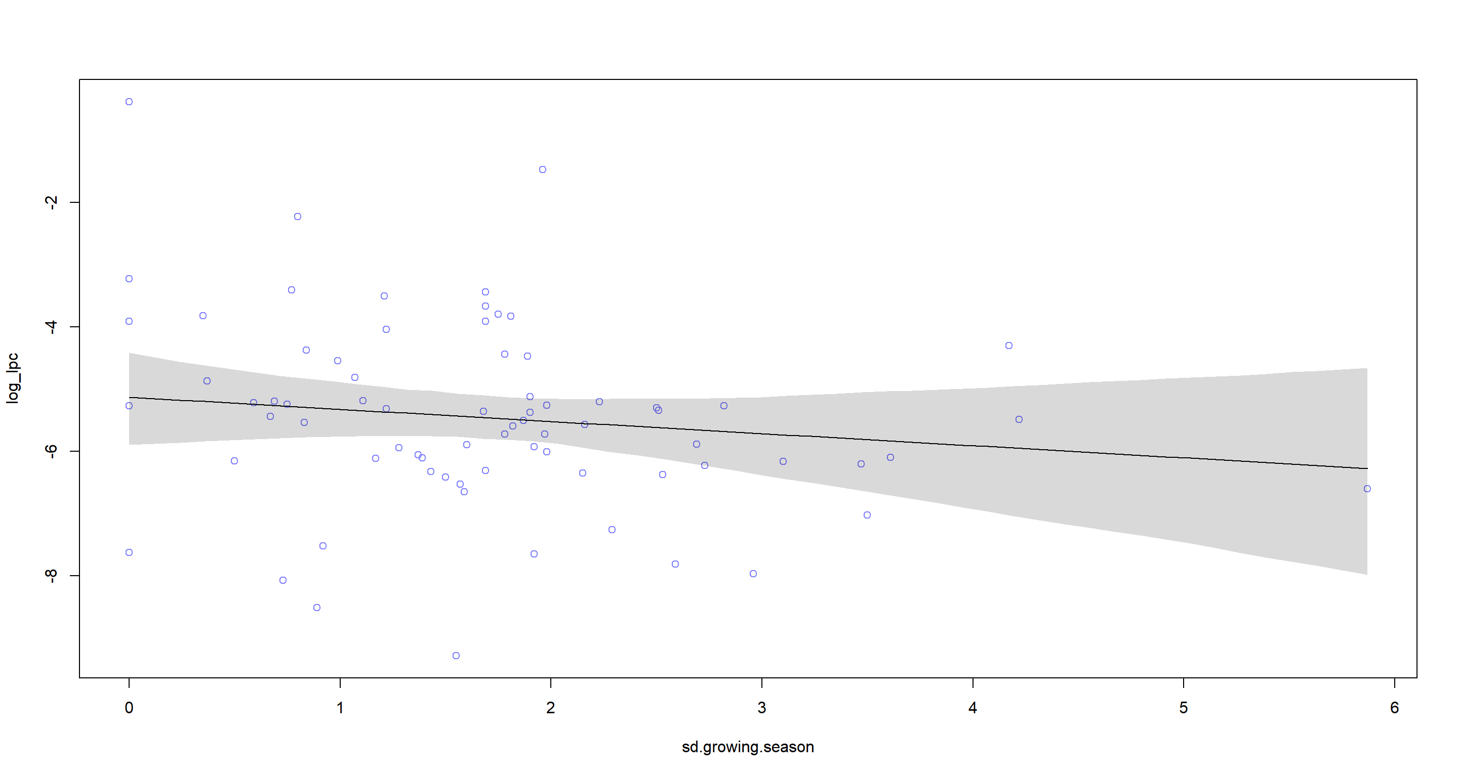 data = dt, col = rangi2, xlim = c(min(d$sd.growing.season), max(d$sd.growing.season)), ylim = c(min(d$log_lpc), max(d$log_lpc)),