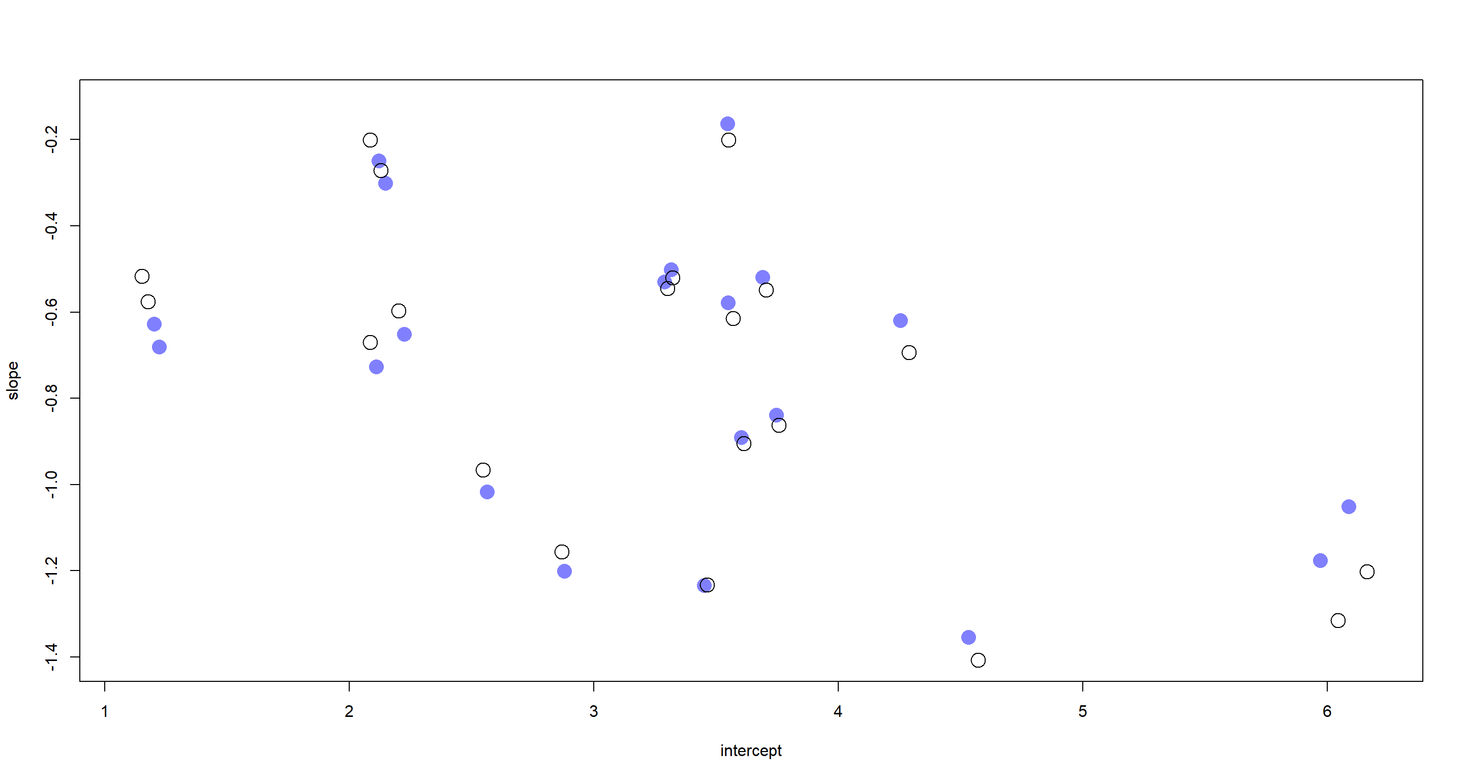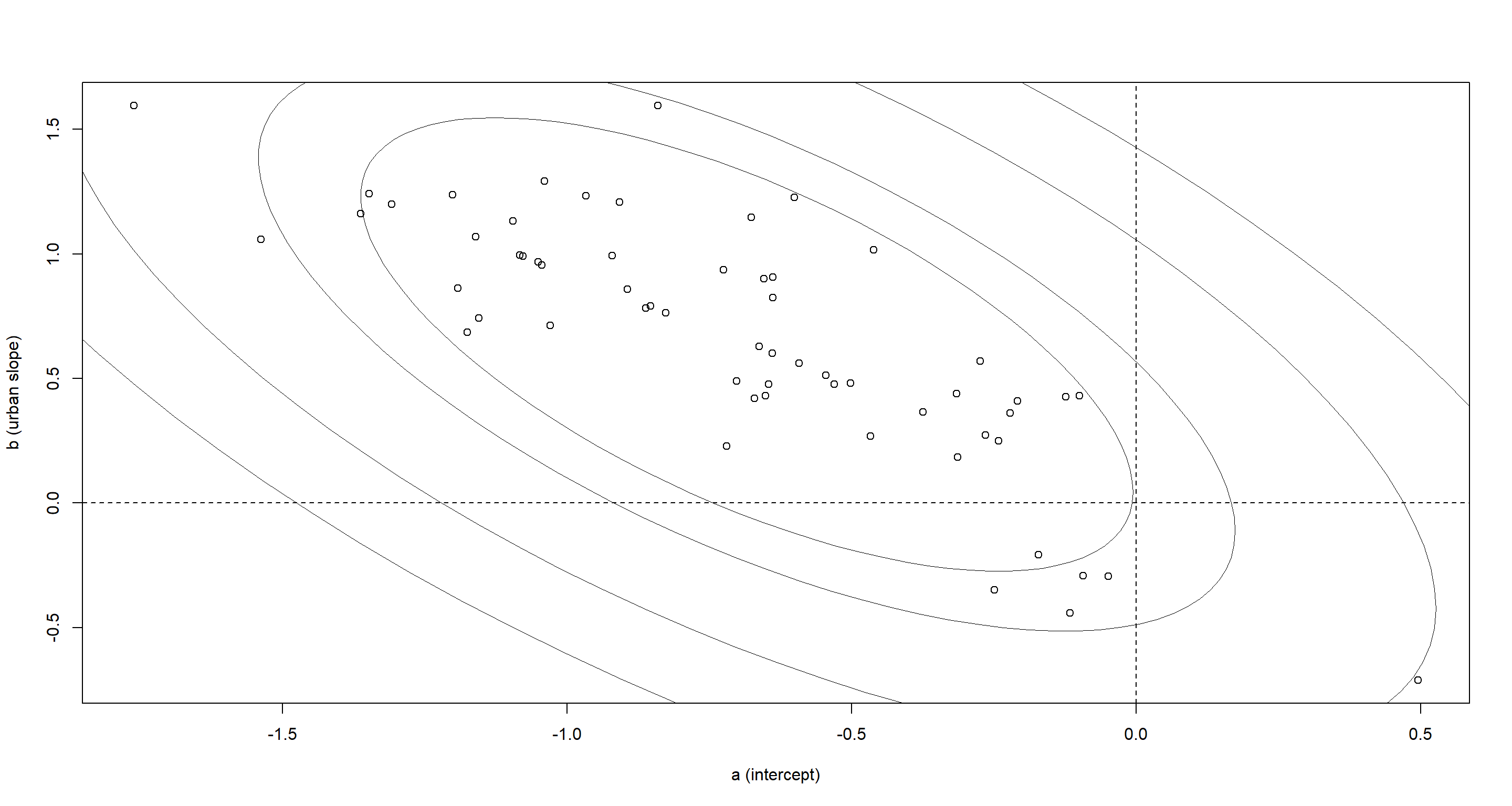 Subsequently, we can sample from the multivariate normal distribution given our variance-covariance matrix to obtain a bivariate distribution of intercepts and slopes: