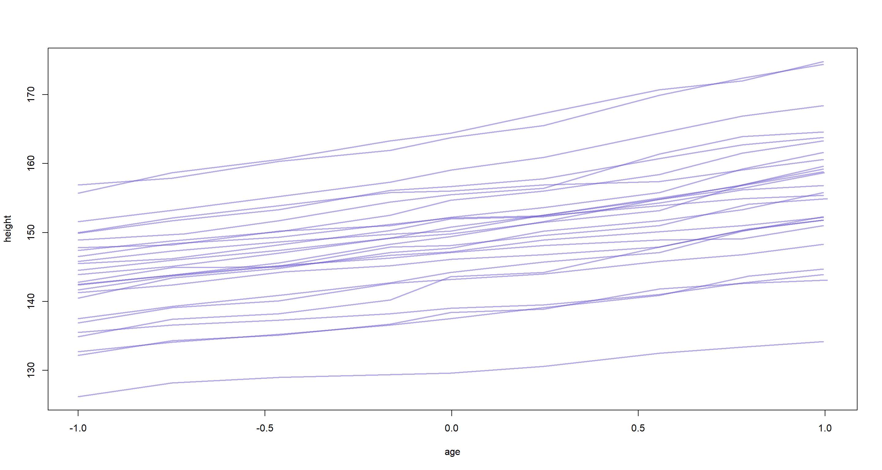 That is, try to simulate varying intercepts and slopes, using the relevant parameter estimates, and then plot the predicted trends of height on age, one trend for each simulated boy you produce. A sample of 10 simulated boys is plenty, to illustrate the lesson. You can ignore uncertainty in the posterior, just to make the problem a little easier. But if you want to include the uncertainty about the parameters, go for it.
