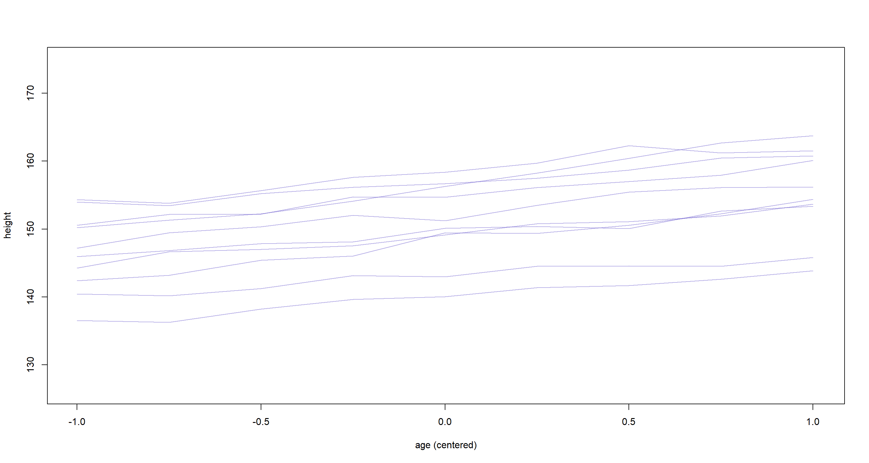 These are individual intercepts and slopes of 10 random boys have which we only need to add to the average intercept and slope values to generate predicted heights for them. Here, we simulate the trend for each boy and add it to a plot: