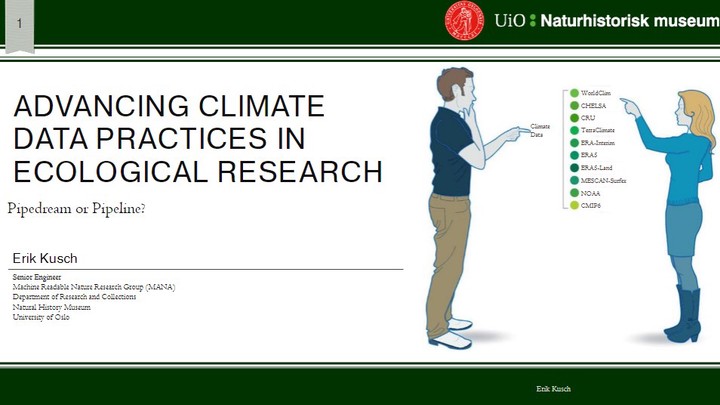 Ecological research, particularly at macroecological scales, is often predicated on delineating the effects of abiotic conditions on biological processes and systems. Despite advances in climate science, much of contemporary ecological research still relies on climate data products which have long been superseded. There exists a considerable wealth of novel products which outperform legacy data products in accuracy, temporal resolution, and provision of uncertainty metrics and climate variable diversity. Consequently, there is an urgent need to develop a workflow through which to integrate these improved data into our analyses. In this seminar, I will present an overview of available climate data sets, their characteristics, shortcomings, and potential for use in ecological research applications. Following from this overview I will elaborate on how to overcome current roadblocks for adoption of improved climate data sets and present a set of suggestions for how to change our view and use of climate data products.